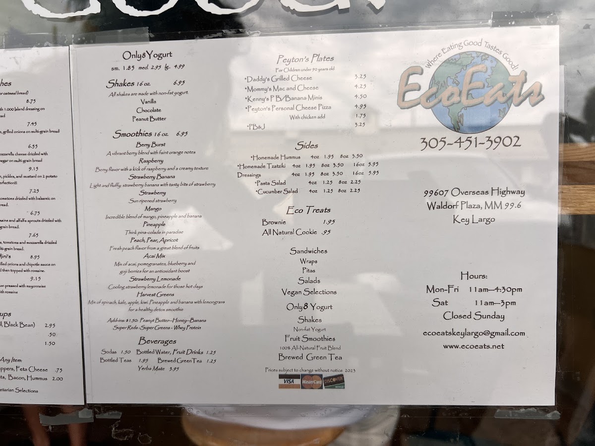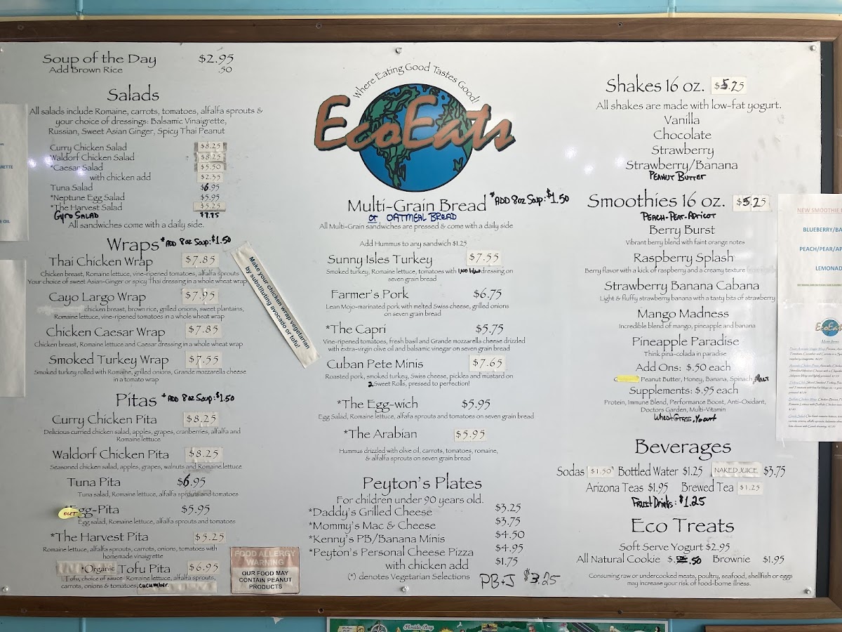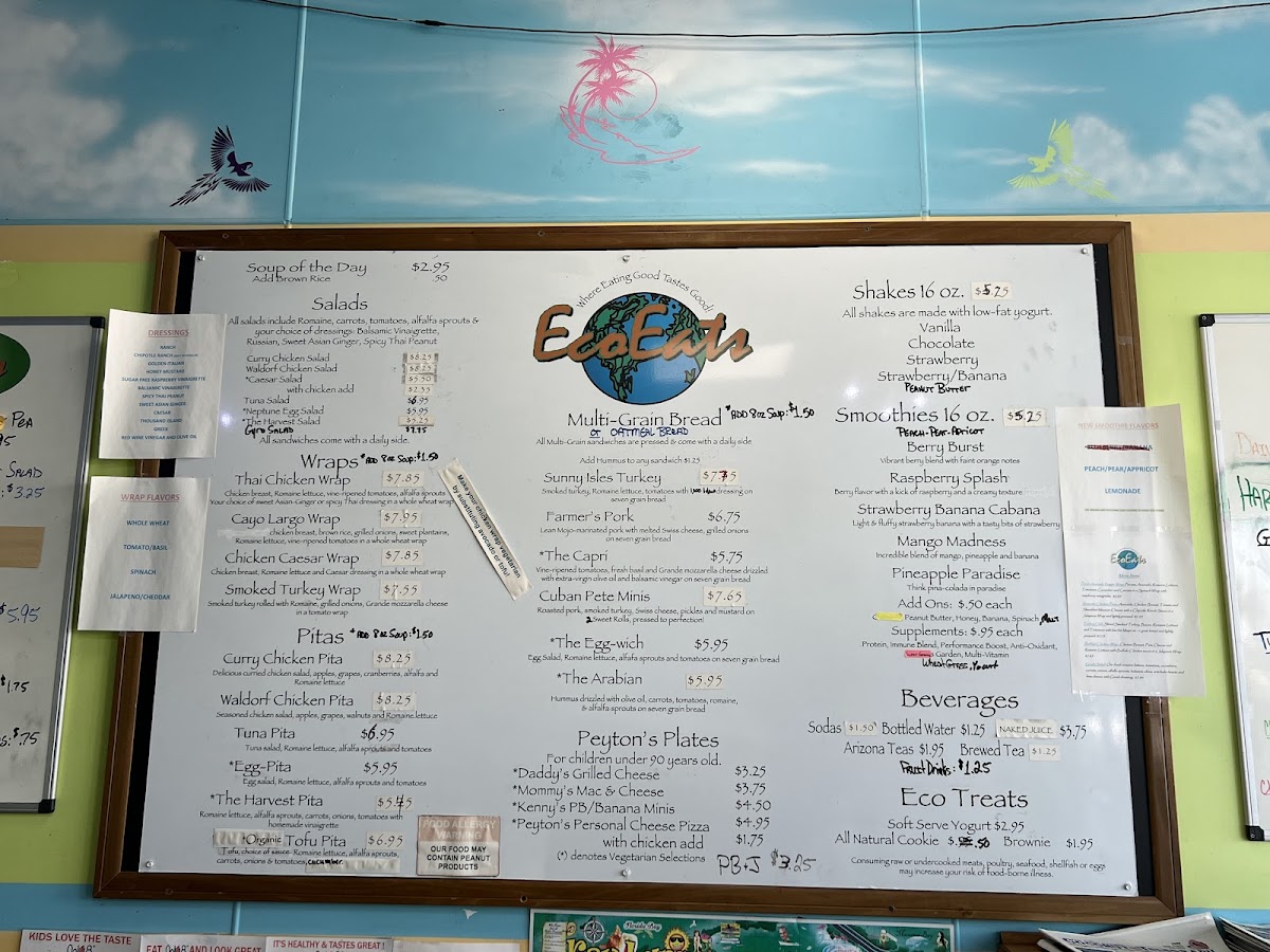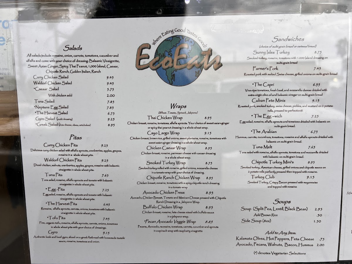 Eco Eats offers a straightforward, casual menu designed for those seeking fresh, health-conscious options without the fuss. The selection centers on satisfying sandwiches, wraps, and pitas made with wholesome ingredients that complement the laid-back atmosphere of Key Largo. Whether you're stopping by for a quick lunch or grabbing a nourishing takeout on the go, the menu fits well with easy, everyday dining moments.